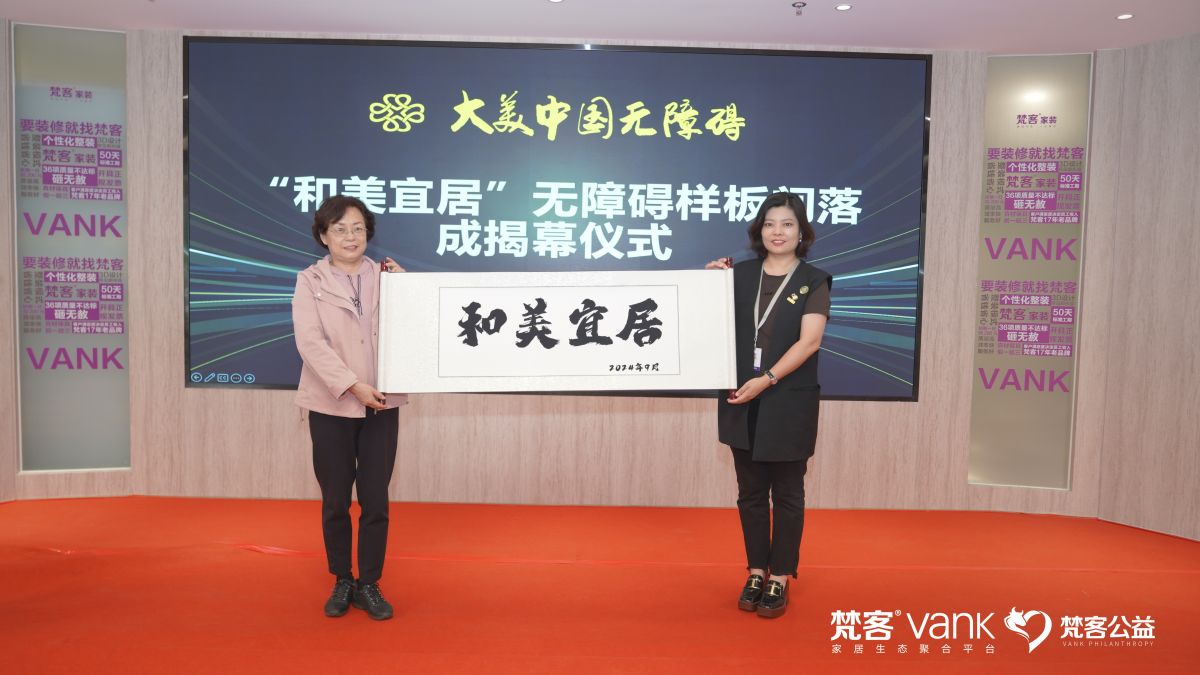 梵客無障礙適老樣板間的研發得到了全國人大常委會委員、中國助殘志愿者協會呂世明會長的專業指導,并親自命名為“和美宜居”。活動現場,中國助殘志愿者協會張超英副會長與梵客集團工裝事業部&社會事業部總監勾麗莉女士共同為“和美宜居”無障礙樣板間揭幕!