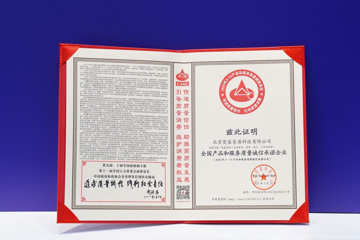 近日,梵客家裝收到來自中國質量檢驗協會頒發的榮譽證書,再度被評為《全國產品和服務質量誠信承諾企業》及《全國質量檢驗穩定合格產品》,再次印證梵客家裝在整裝市場的領軍地位。