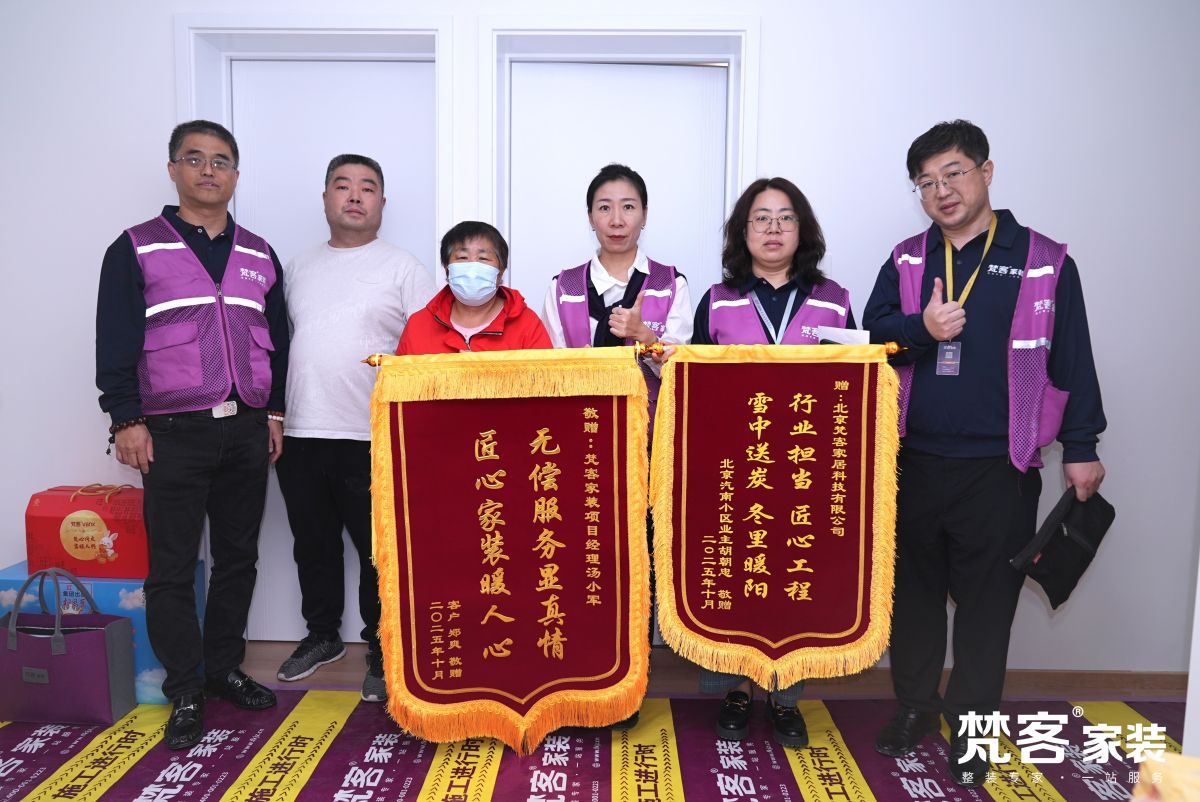 業(yè)主今天也來到現(xiàn)場(chǎng),送上錦旗以表對(duì)梵客家裝的感謝,紅底金字的“雪中送炭”、“無償服務(wù)”耀眼奪目,更堅(jiān)定了梵客家裝做好服務(wù)的決心。巡檢小組也為業(yè)主送上伴手禮,感謝信賴。