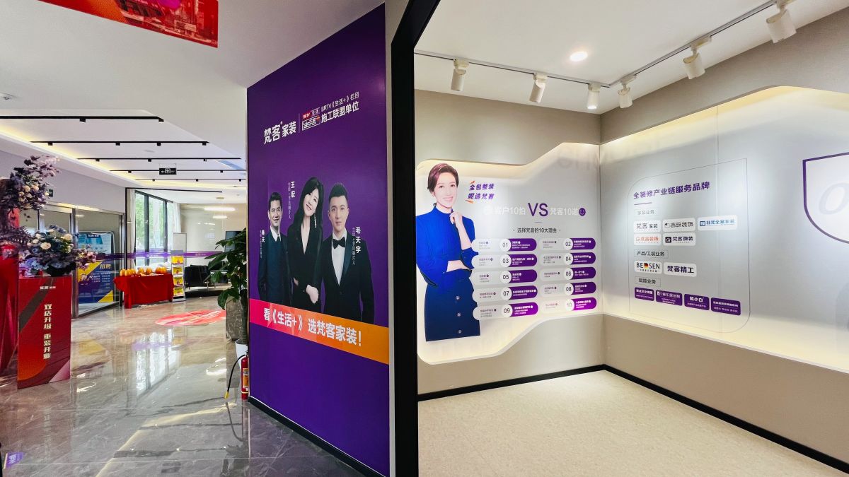 了解一個公司,從品牌開始。梵客家裝的品牌區(qū)就設(shè)置在1F,方便業(yè)主進門即可看到。品牌體系墻還清晰標明3大施工標準,4大設(shè)計標準,5大整體家裝交付體系,60天標準工期等內(nèi)容,幫助業(yè)主更完善的了解施工流程。