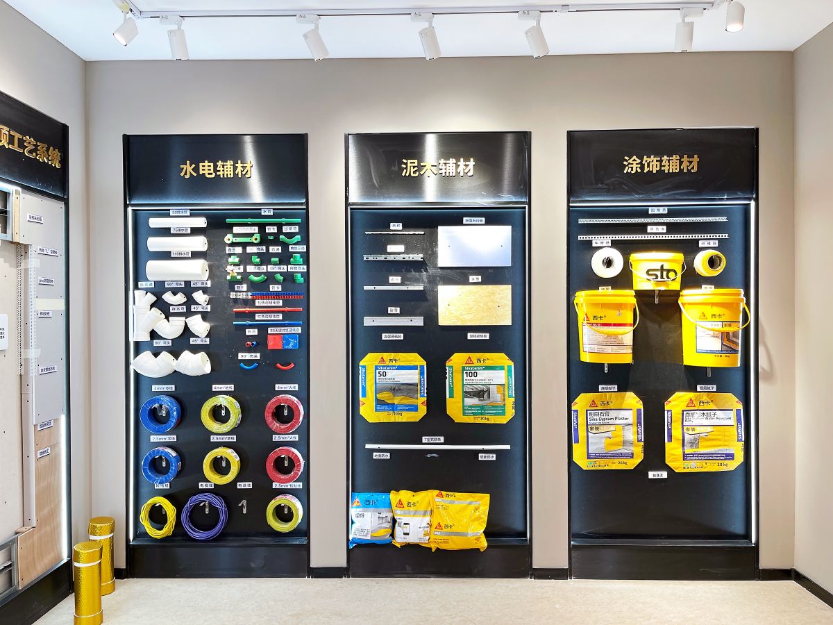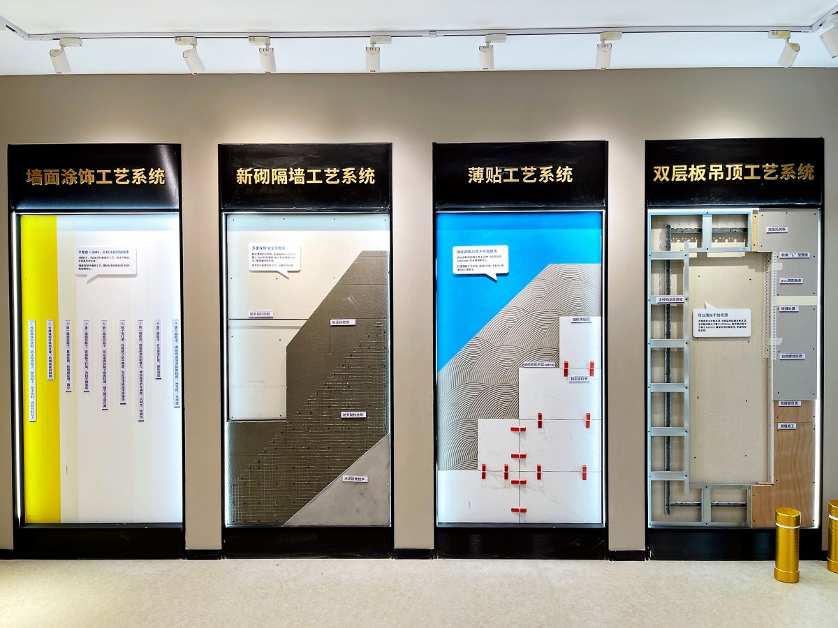 裝修工藝復(fù)雜,大家對工藝也沒有太多了解。1F專門設(shè)置了工藝區(qū),展示并介紹了裝修中最常見到的幾種工藝,如墻面涂飾工藝、新砌隔墻工藝、薄貼工藝、雙層板吊頂工藝,以及強弱電工藝、廚衛(wèi)水電工藝等,方便業(yè)主學(xué)習(xí)、理解,裝修更安心。