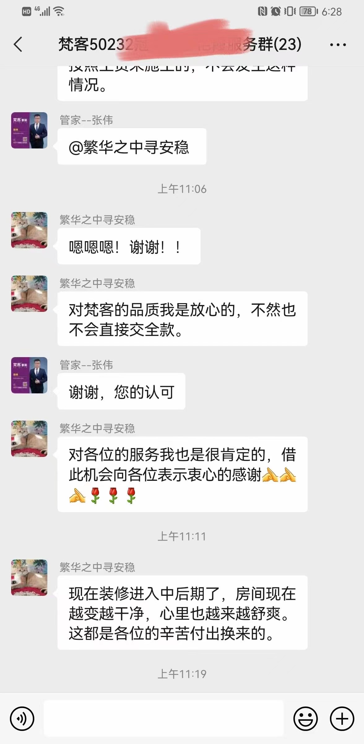 在梵客與業主的溝通群中,也能看出業主對梵客的認可。無論在材料的選擇上,還是工藝、服務等方面,都給予很高的評價。