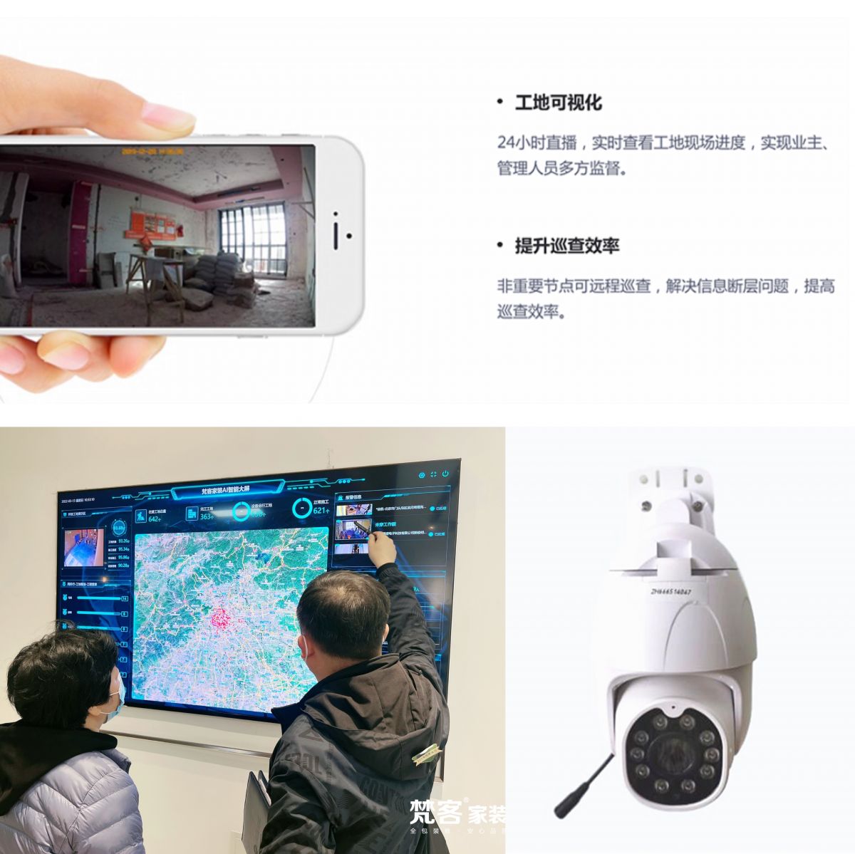 此外,梵客家裝的工地AI化系統,還解決了業主沒時間去工地的問題。AI監理設備,自帶可旋轉云臺,內置GPS定位,有1300萬高清像素,140°廣角鏡頭,可以用手機直接觀看,而且還可以錄像回放,定時拍照,實現24小時工地可視化,即便業主不在現場,也能全方位了解自家裝修進度及狀況,遇到問題及時和設計師或工長溝通。