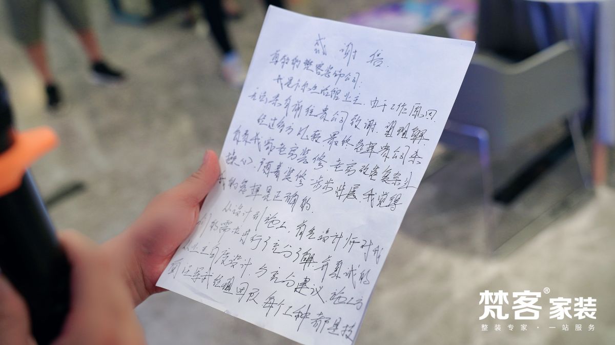裝修完的業主朋友專程來梵客送上錦旗,手寫感謝信,一筆一劃都是誠懇。贊揚梵客服務好、工藝精湛、技術過硬,對新家非常滿意,對設計師、工長等也表示感謝。