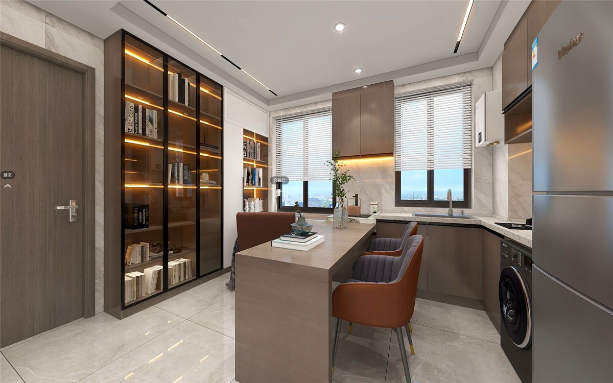 餐廳+廚房+書房的多功能區,是整個家庭的公共區域兼活動中心。原房型為1廚+1餐廳,打通中間的墻,改為開放式大格局,視野更開闊,采光通風也更好,還有助于家庭成員之間的互動。