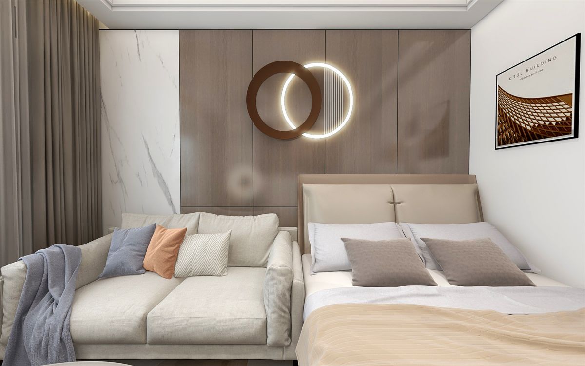 臥室+休閑區,靠墻的一邊是床,靠窗的一邊是沙發、電視。再打通陽臺與臥室之間的隔窗,改為吧臺,以淺色系為主基調,小空間更顯明亮,視覺通透感更強。從餐廚到臥室再到陽臺,地磚通鋪,沒有過門石,一鏡到底,空間敞亮。