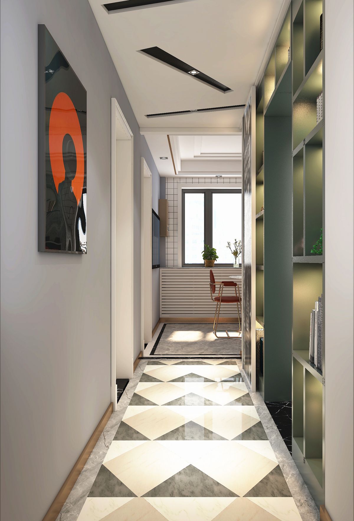 廊廳采光不佳,書柜內設燈光照明,不僅讓這個小區(qū)域光彩奪目,也方便平日拿取書籍。幾何圖形的地磚時尚又閃亮,現(xiàn)代輕奢風若影若現(xiàn),反射出的光源也為空間增加了一絲亮度。