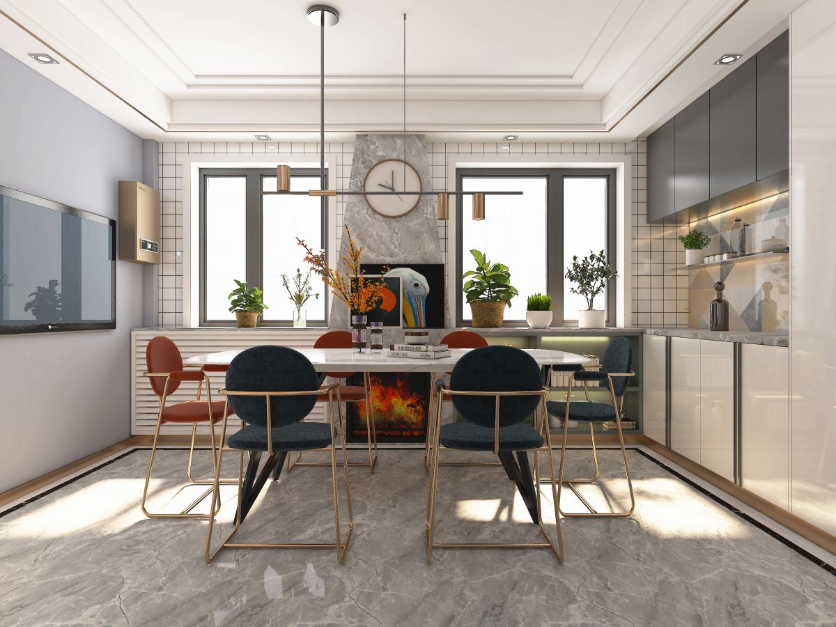 石材被廣泛運用在整個空間,由地板蔓延至墻面,營造出高貴、大方的氛圍。為了美化暖氣管道,專門設計了一個裝飾壁爐,大理石裝飾,成為餐廳一景。