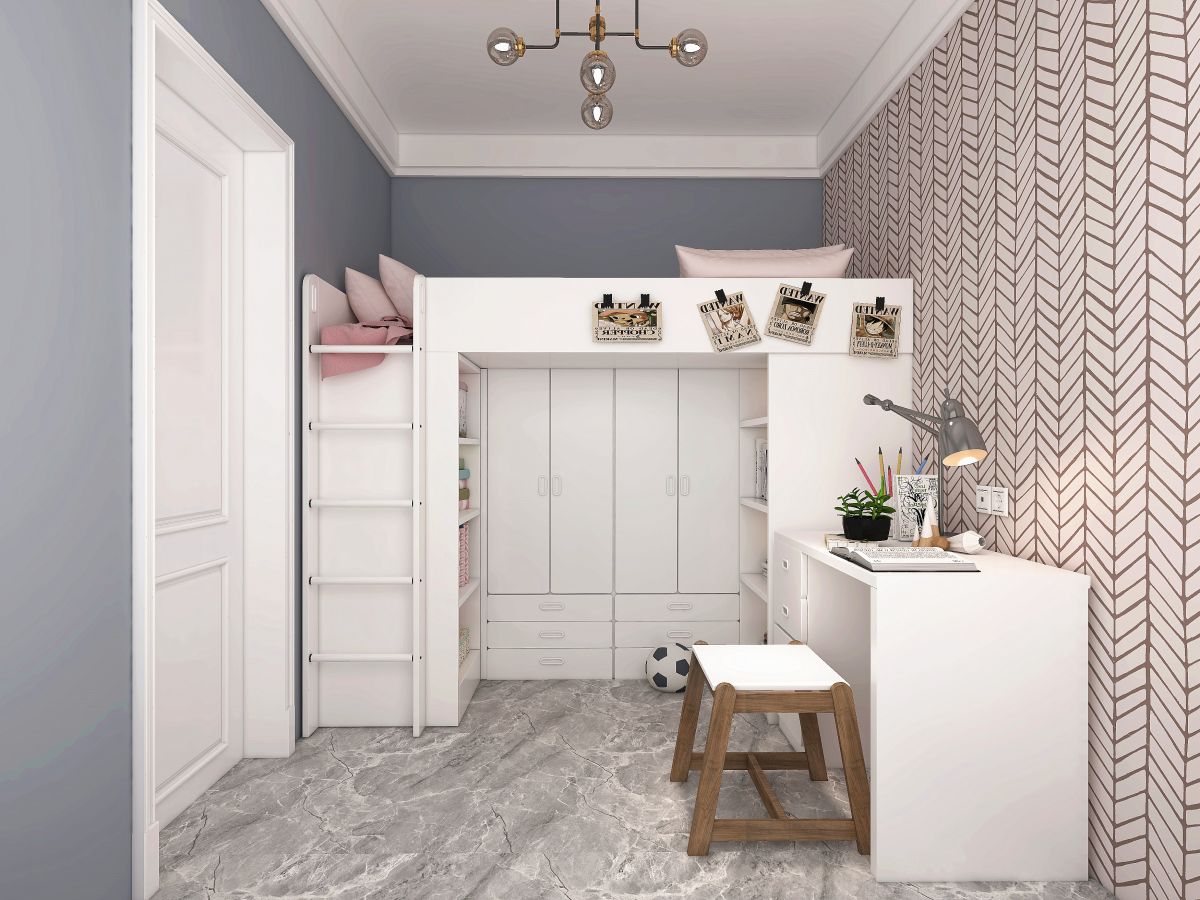 將衣柜、書架與床合三為一,床的下方是衣柜和書架,非常節(jié)約空間,適合小戶型,而且還預留出更多的地面空間,方便小朋友玩耍。