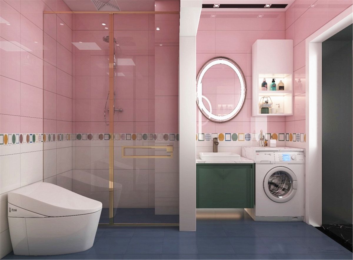 作為私密空間,業(yè)主希望浴室的設計能大膽一些。充滿浪漫氣息的櫻花粉成為主打色,五彩腰線俏皮絢麗,裝點著整個空間,帶來輕松愉悅的視覺體驗。